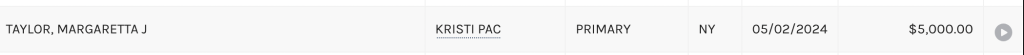 See her $5,000 donation to Kristi Noem’s PAC in 2024, just months before her appointment as Homeland Security Secretary below,